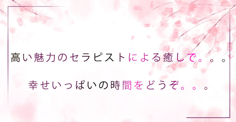 当店では、アロマオイルの効能と当店自慢のセラピストによるリンパマッサージの相乗効果による、癒しのひとときをお客様お一人お一人にお届けしております、自然で心やすらぐ優美な香りを、施術中はもちろんご帰宅お休みになってから翌日朝目覚めでまで楽しんで頂けます、どうぞゆっくりご堪能ください。